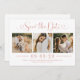 Modern guld och vita bröllop spara datum-annonskort i ro har ett kollage av tre bilder med fyrkantig förlovning och en snyggt med kalligrafi av chic och hjärtaccenter. Den enkla och elegant anpassningsbar som kan vara helt personlig med det numeriska datumet för bröllop, briden och groom namn, platsen för ceremonin, bröllop webbplats och en formell inbjudan att följa ordalydelsen.