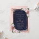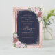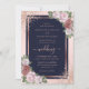 Elegant Blåblått, och ro guld-blommigtens bröllopsinbjudan med en ro-guld ram som är förankrad med rosa ros och ro guld konetti.