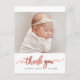 Simple Modern Elegant Calligraphy Ro Guld Script Photo Newborn Baby Tack Postcard. Har en vacker "tack"-text i ett handskrivet kursivt skript för kalligrafi-byten i svan i faux-folie för ro guld (eller folie för rosa). På motsatt sida finns ett personligt meddelande. Underbar för flicka. Enkel att anpassa med ditt baby-foto och din information.