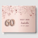 En gästbok för en girig och glamorös 60:e födelsedagsfest. En faux ro guld-bakgrund med ro guld, rosa, droppstjärnor. Anpassa och lägg till namn och datum. Namn är skrivet i mörk ro guld med ett modernt handskript i stil. Nummer 60 skrivs med ett stil-teckensnitt med ballong.