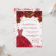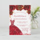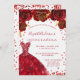 En modern, snyggt och glamorös inbjudan till en Quinceañera, 15:e födelsedagsfesten. En vit bakgrund med gnistor, en röd klänning och röd ros, blommigtar. Namn är skrivet med ett modernt handskript i stil. Anpassa och lägg till information om party.