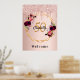 För en 50:e (eller någon ålder) födelsedagsfest. En faux-metallisk bakgrund i ro tittar med ett faux-guld geometriskt ram. Dekorerad med mörkens lila och burgundblommor, ro, fjädrar från Bho stil och faux glitter drop, färgdroppstift. Anpassa och lägg till namn och åldern 50 år. Namn är skrivet med ett handskript i stil. Med texten välkommen.