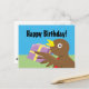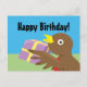 Ett underbart vykort för tecknadens födelsedag med en brun och röd rån (engelsk sort) som håller upp en lila och gult mot en blå himmel. Det står Grattis på födelsedagen