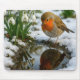 A robin gazes at its reflection in a small puddle, amidst a peaceful scene of delicate snowdrops and soft, white snow