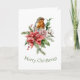 En Robin bland en poinsettia och ett ro och grönt julhälsningskort.
