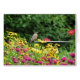 Robin besöker fågelbadet omgiven av blommor. Wildlife, blommigtens image fångad i New Hampshire.