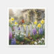 A robin sits on a white picket fence amidst colorful spring flowers, with a stone cottage adorned with flowering vines in the softly lit background