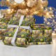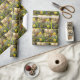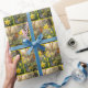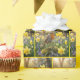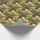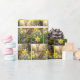 In a sunlit garden, a robin sings atop a moss-covered rock into a yellow daffodil, surrounded by blooming bluebells and daffodils in springtime