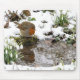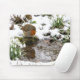 The robin gazes intently at its reflection in a melting snow puddle, surrounded by a vibrant spring garden adorned with delicate snowdrops