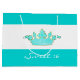 En stor presentpåse i chic i en robins äggblått och vitt vågrät rand mönster. Bilder med blått och guld-ton krona, dekorerar vägens mitten. Anpassa den vita texten grund i påsen till kostym i tillfälle. Underbar för födelsedagar, Söt 16, grattisar och Quinceañera.
