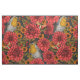Robins i höstträdgården, röda dahlias på svart tyg