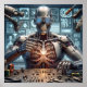 A humanoid robot is seated at a workbench surrounded by tools and intricate components. The setting is futuristic with digital screens in the background.