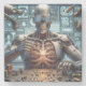 A humanoid robot is seated at a workbench surrounded by tools and intricate components. The setting is futuristic with digital screens in the background.