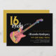 16 Sten 16:e födelsedagsfest inbjudan med en coola elgitarr, färgstark funky mönster och rosa plocka vaktgitarart och musik noter illustration med personlig svart och guld modern kalligraftypografi. Den här lättförståeliga mallen för använda skapar inbjudan till personlig i perfekt att fira sexton i rock n roll stil och är idealisk för en guitarist, musiker och musikalisk älskare. Alla gitarrer säger att man aldrig kan ha för många gitarrer. Den här coolan firar den moderna musikinstrumentdesignen musikenergin hos detta underbara musikinstrument och är perfektens väg till sten en sextonårsdag för högtidlighållande. Originalkonstverk av konstnären Catherine Sweetman