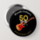Fira hans femtioårsdag i rock and roll-stil med denna coola 50 Rocks personliga svarta knapp för 50-årsfirande. Om det är din rockstjärna-make, pojkvän, pappa eller vän, kommer denna coola illustration med elgitarr i flamstil med röd pickguard, musiknoter och modern typsnittskript i guld att fira dem i rock n roll-stil. Lätta att använda mallar så att du kan lägga till namnet på den som firar födelsedag, perfekt för ett svart och guld färgtema. Kolla in samlingen "50 Rocks" för matchande festartiklar för 50-årsfirande i rock and roll-stil. Musiker, gitarrspelare och de som älskar live musik kommer att älska detta trendiga musiktema. Originalkonst av konstnären Catherine Sweetman