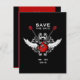 Meddela din bröllop med detta okonventionella Spara Datumet-kort i rock and roll-stil med korslagda elektriska röda rockgitarrer, vingar och vintage-ornament på svart.