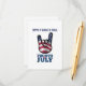 Hand med rock and roll-hornsymbolen med amerikansk flagga inbäddad i den. "Ha en Rock N Roll" ovan och "Fjärde juli" nedan.