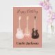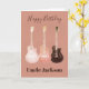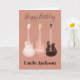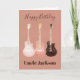 Till din coola rock n roll-farbror, vare sig han är en gitarrist med exceptionell skicklighet eller en luftgitarrist, är detta kortet för honom. Coola landsbygdsillustrationer i rustik stil av tre semi-akustiska gitarrer i något genomskinliga, avskalade vita, ljusbruna och mörkbruna nyanser på en dämpad lerbakgrund. Orden "grattis på födelsedagen" kan anpassas och din farbrors namn läggas till genom att använda mallen för att skapa ett personligt kort till din musikälskande farbror på hans speciella dag. Originalkonst skapad av konstnären Catherine Sweetman