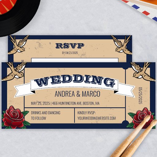 Denna alternativa tatuering stil är perfekt för ett par som tatuerar kärlek, skjuter i höjden och ger estetik. Ro, sväljer och tatueringsskriptet för calligrafi skapar en kombination av perfekter för ett icke-traditionellt bröllop. Den här inbjudan till ett bordningspass-bröllop som görs som bröllop biljett är perfekt för ett Halloween bröllop eller hallobröllop, men fungerar också underbart för tatueringsentusiaster år runt. Besök FireSparks-butiken för att hitta matchande kontorsmaterial och tillbehör till bröllop. https://www.zazzle.com/store/firesparks/collections