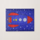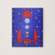 En blå och röd frakt sprider sig genom rymden, i den här lilla rymden älskare design!