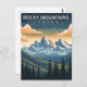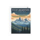 Celebrate the wild beauty of the north with this stunning Rocky Mountains Travel Card. This vintage-style illustration captures the dramatic, sun-drenched peaks of the Canadian range as they rise above a deep valley of towering pine and fir trees under a moody mountain sky.