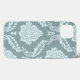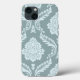 A vintage style decorative damask off-set surface pattern influenced by rococo classical design in duck egg blue color detail on a teal background.