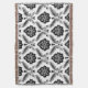 A vintage style decorative damask surface pattern influenced by rococo classical design in black and grey details on a white background.