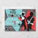 Partynågot liknande en rockstjärna! Aqua och röda stjärnor på grå färgbakgrund med pojken som sjunger och leker gitarrrockstjärnan, tackar dig att card.