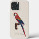Bilden presenterar en fint detaljerad illustration av den scharlakansröda aran (Ara macao), även känd som rödbröstad ara, elegant sittande på en strukturerad gren. Detta konstverk är karakteristiskt för den förfinade naturhistoriska stilen som Jacques Barraband var pionjär för, vars noggranna uppmärksamhet på färg och anatomi gav exotiska fåglar liv i tidiga vetenskapliga publikationer. Den scharlakansröda arans livfulla röda fjäderdräkt dominerar kompositionen, kompletterad av slående band av gyllene gult och djupblått längs dess vingar och långsträckta stjärt. Dess robusta, böjda näbb och bleka ansiktshud, vars fjädermönster är fint tecknade, återges med precision, vilket betonar både skön