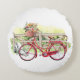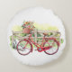 Söt runda kuddar för ditt hem- eller kontorsdekoration som har en vattenfärgskonstruktion för en röd cykel med blommor i sitta i basket framför ett trästängsel och grönt betesmark/mark.