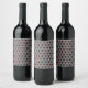 Röd bild under grått tallrikar, rektangulära forme vinflaska etikett