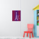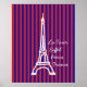 Grafikvit Eiffel Torn med text över en strimlad bakgrund med fransken färg