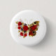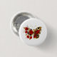 Röd blomsterfjäril med rött texturerat vinge, dekorerad med rödfärgad, artificiellt målad ro med gyllene stjälkar och löv på vit bakgrund.