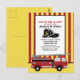Röd och gul randig brandbil / brandman barn 5-års födelsedagsfest inbjudan vykort. Texten säger "Larmar ut, BARNETS NAMN fyller 5." Lägg till egna instruktioner längst ner. Vårt säger "Ta med extra kläder. Vi kommer att bli blöta."
