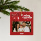 En röd bakgrund, vit text och en röd båge. Text och foto. God jul är skrivet med ett stil-retro-teckensnitt.