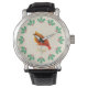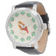 Vacker röd fågel omgiven av järnekbär på ljusbeige bakgrund.