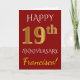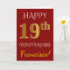 Denna enkla, personliga gratulationskortdesign för bröllopsdag har meddelandet "HAPPY 19th ANNIVERSARY", där "19th" har ett falskt guldliknande utseende. Framsidan har också ett anpassat namn och en röd bakgrundsfärg. Insidan har ett anpassningsbart gratulationsmeddelande för bröllopsdag. Det kan ges till en make eller maka för att fira parets nittonde bröllopsdag.