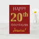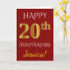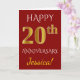 Denna enkla, personliga gratulationskortdesign för bröllopsdag har meddelandet "HAPPY 20th ANNIVERSARY", där "20th" har ett falskt guldliknande utseende. Framsidan har också ett personligt namn och en röd bakgrundsfärg. Insidan har ett anpassat gratulationsmeddelande för bröllopsdag. Det kan ges till en make eller maka för att fira parets tjugoårsjubileum.