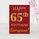 Denna enkla, personliga bröllopsjubileumskortdesign har meddelandet "GRATTIS PÅ 65-ÅRSJUBILEUM", där "65" har en falsk guldliknande look. Framsidan har också ett anpassat namn och en röd bakgrund. Insidan har ett anpassat bröllopsjubileummeddelande. Det kan ges till en make eller maka för att fira parets sextiofemte bröllopsjubileum. [~Z0000078]