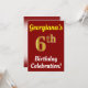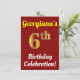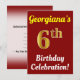 Denna födelsedagsfestinladningsdesign har ett meddelande som "Georgianas 6-års födelsedagsfirande!", där namnet kan anpassas, och där siffran "6:e" har ett falskt guldliknande utseende. Den har också en röd färgad bakgrund. Evenemangsinformationen på baksidan kan anpassas. Den kan användas för att inbjuda människor till någon sjätte födelsedagsfirande eller födelsedagsfest.