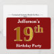Den här inbjudan har ordningstalet "19:e" med ett faux guld-liknande utseende. Den har också ett anpassade namn och en röd bakgrund. Händelseinformationen på baksidan kan vara personlig. Den skulle kunna användas för människor i inbjudan till någons nittonde födelsedagsfest. [~Z0000012]
