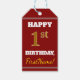 Den här märkrn med födelsedagspresent innehåller ett meddelande som "LYCKLIG 1:a BIRTHDAY, FirstName!", där namn kan anpassas och där numret "1:a" har ett utseende som liknar guld-liknande färg. På framsidan finns också en röd färgad. Baksidan har en Från:-linje. Märkre av födelsedagspresent som dessa skulle kanske kunna användas på gåvor som ges till någons första födelsedag. [~Z0000207]