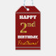 Den här märkrn med födelsedagspresent innehåller ett meddelande som "LYCKLIG 2:a BIRTHDAY, FirstName!", där namn kan anpassas och där siffran "2:a" har ett utseende som påminner om Faux/imitation guld-liknande färg. På framsidan finns också en röd färgad. Baksidan har en Från:-linje. Märkre av födelsedagspresent som dessa skulle kanske kunna användas på gåvor som ges till någons andra födelsedag. [~Z0000207]