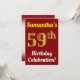 Födelsedagsfest inbjudan har ett meddelande som "Samantha's 59:e födelsedagshälsningen!", där namn kan anpassas och där siffran "59:e" har ett utseende som liknar guld. Den har även en röd färgad. Händelseinformationen på baksidan kan anpassas. Det skulle kunna användas för inbjudan till någons femtionionde födelsedagskalender eller födelsedagsfest. [~Z0000120]