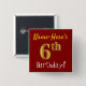 Den här enkla fyrkantiga knappdesignen innehåller ett meddelande som "Namn-här’s 6e Birthday!", där "6e" har ett utseende som påminner om guld, som liknar faux/imitation, på en röd färgad. Namn kan anpassas. Knappar som dessa kan kanske bäras av gäster i en födelsedagsfest till någon som firar sin sjätte födelsedag, där party hålls i ett stort område med många andra närvarande personer (t.ex. en stadspark eller en temapark). [~Z0000163]