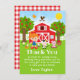 Detta söta och roliga tackkort har en rödhårig flicka med ljus hy bredvid en röd lada med en väderflöjel i form av en tupp. Det finns söta lantdjursdjur som en ko, gris och höna. I bakgrunden syns en klarblå himmel, äppelträd, solsken, fjärilar och tusenskönor. Texten kombinerar feta och sans-serif-teckensnitt för en stilren och modern look. Detta är perfekt för en lantbruks-inspirerad födelsedagsfest.
