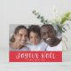 Det här glada julkortet säger "Joyeux Noël", eller God Jul på franska, med modernt fantasifull vit typografi på festlig röd bakgrund. Det finns plats för ditt favoritfamiljefoto!