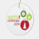 En julprydnad som presenterar en illustration av tre prydnadar, dekorerade med en snowflake, en julgran och en stjärna. Text "god jul" på vänstersida. Personifiera med året. Designen har en röd & grön färgintrig.