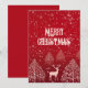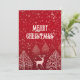 Röd julhälsningskort med snöflingor, träd och hjort. Julkort med en riktigt festlig stämning, anpassningsbar text. generativt innehåll