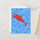 En röd haj-figur på en blå mönstrad bakgrund. Hajen och det blå mönstret är en tryckt design, det är inte en upphöjd eller texturerad design.